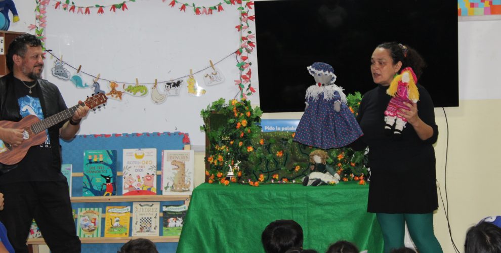 El miércoles primero de abril, damos inicio formalmente a la celebración del mes del libro en nuestro colegio, y como actividad previa, este lunes recibimos la visita de a la reconocida escritora valdiviana Mónica Munizaga, quien presentó junto al cantautor Javier Milanca, “Había una vez un Cuento”, relato que recupera personajes de cuentos clásicos de los hermanos Grimm como, Caperucita roja, Hanssel y Gretel, Los tres Cerditos y Risitos de Oro.