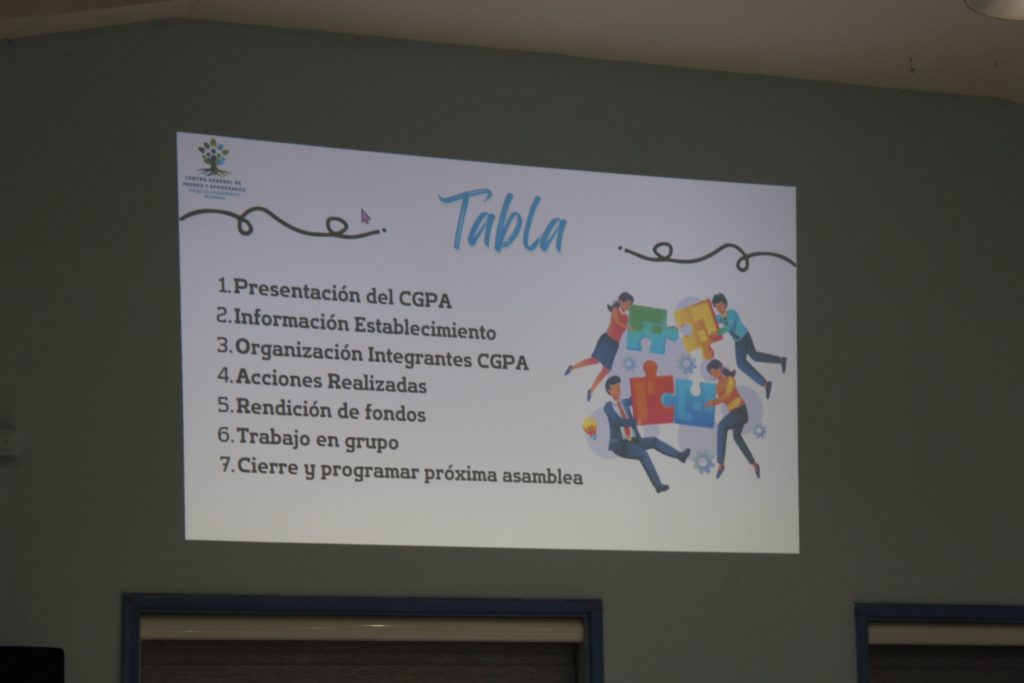 La actividad inició con palabras de bienvenida de la directiva actual hacia los apoderados asistentes y los invitó a hacerse parte de su equipo de trabajo. Posterior a ello, luego de los saludos del director del colegio, fueron instruidos sobre responsabilidad penal adolescente, que estuvo a cargo del Suboficial Claudio Cartes, delegado del cuadrante del sector.